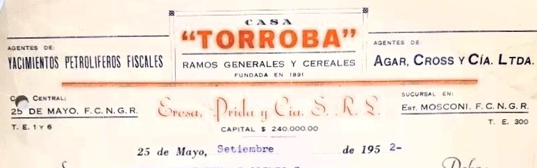 CASA TORROBA ES PROTAGONISTA DE LA HISTORIA Y PARTE FUNDAMENTAL DEL AVANCE DEL COMERCIO EN NUESTRA REGIÓN PAMPEANA, CONSTITUYÉNDOSE EN UNA MARCA REGISTRADA QUE A LO LARGO DEL TIEMPO SE RAMIFICA ENTRE FINES DEL 1800 Y PRINCIPIOS DEL 1900 EN VARIAS LOCALIDADES DE LAS PROVINCIA DE BUENOS AIRES Y EL ENTONCES TERRITORIO NACIONAL DE LA PAMPA, SIENDO ACTUALMENTE NUESTRA FIRMA COMERCIAL LA ÚNICA QUE AÚN PERSISTE Y CONTINÚA ACTIVA FUNCIONANDO CON EL FORMATO ORIGINAL DE ALMACÉN DE RAMOS GENERALES EN LA LOCALIDAD DE AGUSTÍN MOSCONI, PARTIDO DE 25 DE MAYO, SOSTENIENDO UNA RICA TRADICIÓN DE TRABAJO CONSTANTE DESDE HACE MAS DE 130 AÑOS.